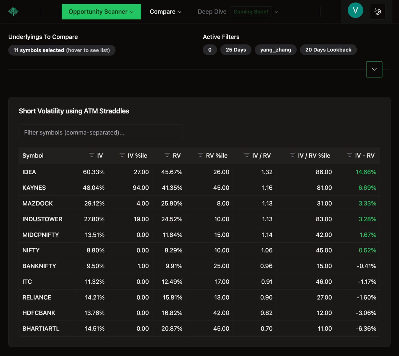 Institutional-grade options analytics without the complexity. Spot mispriced volatility and identify trade opportunities across 150+ NSE underlyings by the metrics that actually matter.